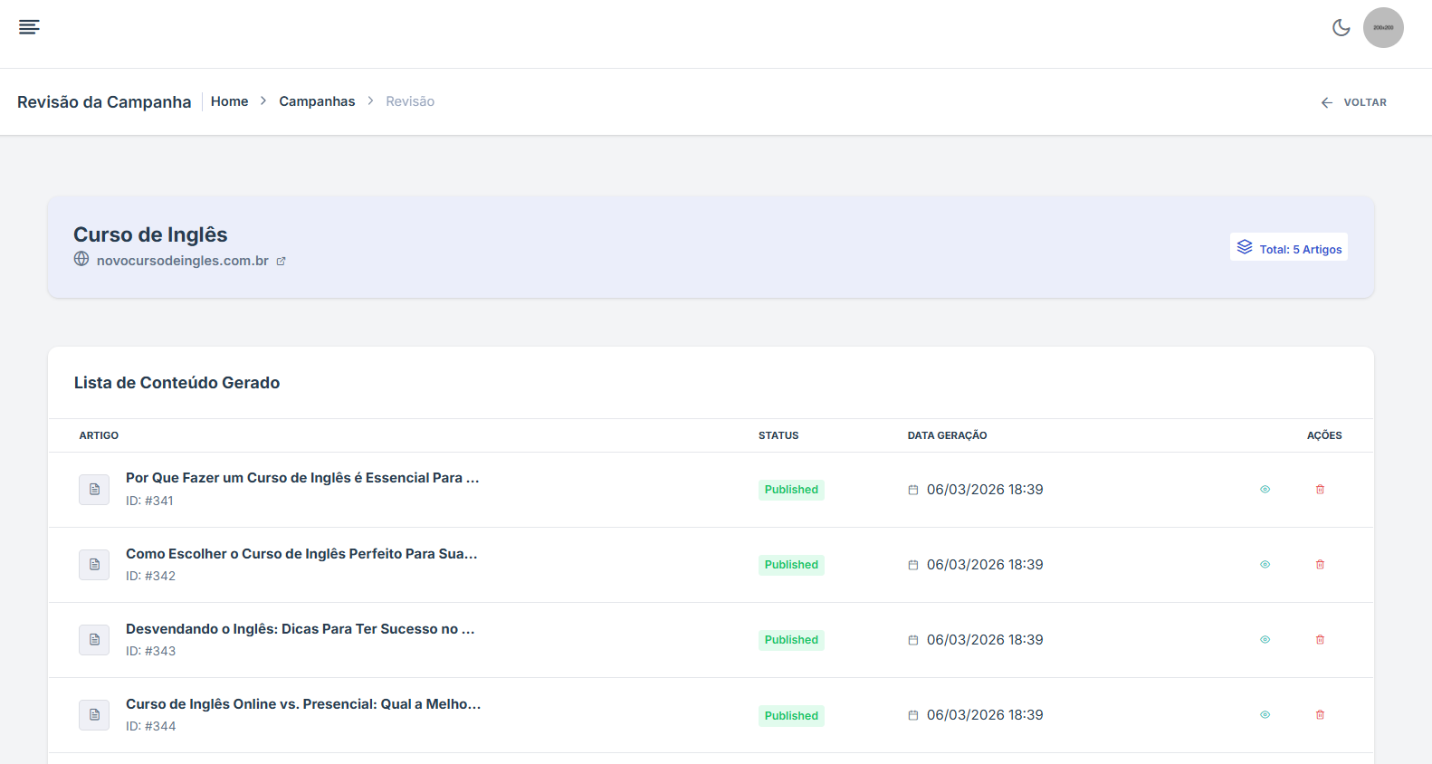 5. Os textos gerados são originais ou sofrem de plágio? Cada artigo é criado do zero, palavra por palavra, no exato momento em que clica em gerar. A nossa inteligência articula os dados originais focados na sua palavra-chave, garantindo que o seu blog receba conteúdo 100% livre de plágio e estruturado para o ranking.