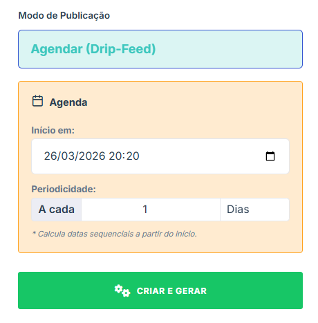3. O que é exatamente o “Agendamento Seguro” (Drip-Feed)? Publicar 30 artigos no mesmo minuto é um alerta vermelho de spam para o Google. O nosso “Agendamento Seguro” resolve isso distribuindo as suas publicações de forma cadenciada. Pode configurar para sair um artigo a cada 24 horas, simulando um cronograma de postagem 100% humano.